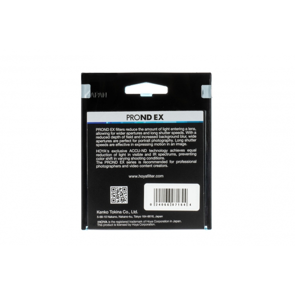 Hoya PROND EX filtry jsou šedé, barevně neutrální filtry, které redukují množství světla dopadajícího na film nebo čip kamery. Nijak neovlivňují barevné vyvážení fotografovaného obrazu. Hoya PROND EX filtry jsou určené pro použití pomalého času nebo menšího clonového čísla.